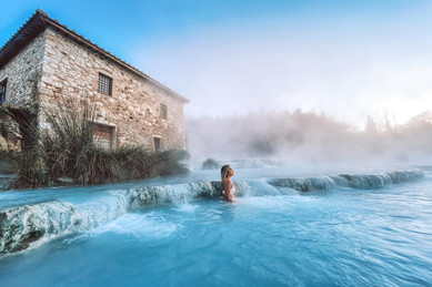 Cascate del Mulino เจ้าบ่อน้ำนี้ เป็นบ่อน้ำพุร้อนธรรมชาติ ตั้งอยู่กลางหุบเขา มาจากลำธารสีฟ้าตกลงมาบนบ่อหินปูนสีขาว ลดหลั่นลงมาเป็นชั้น ๆ แบบที่เห็น มีน้ำแร่และกำมะถันอยู่มาก แช่แล้วรับรองว่ากลิ่นกำมะถันติดตัวทั้งวันเค้าว่ากันว่าช่วยเรื่องในการบำบัดรักษา ที่แช่กันตั้งแต่ยุคสมัยชาวโรมันกันเลยทีเดียว ดูความพีคของเรื่องราวก็ยิ่งทำให้อยากไปแบบสุด ๆ